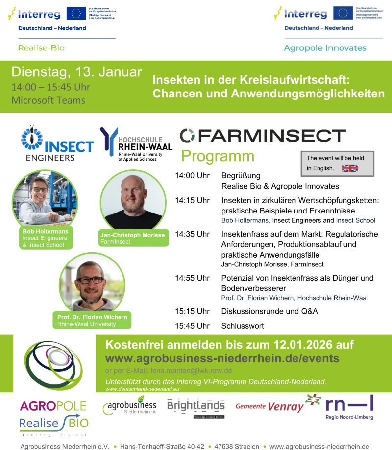 Die Kreislaufwirtschaft gewinnt zunehmend an Bedeutung und Insekten spielen bei diesem Wandel eine Schlüsselrolle. Die beiden Interreg-Projekte Realise-Bio und Agropole Innovates laden Sie herzlich zu diesem spannenden Webinar ein. Entdecken Sie, wie Insekten innovative Lösungen für eine effizientere Ressourcennutzung bieten und Nebenströme in hochwertige Produkte verwandeln. Experten aus Praxis und Forschung zeigen, wie diese Ansätze nicht nur ökologische Vorteile bieten, sondern auch neue wirtschaftliche Chancen schaffen. Sie erhalten wertvolle Einblicke in die Verwendung von Insekten und ihren Nebenprodukten für Tierfutter, Düngemittel und andere Anwendungen. Darüber hinaus erfahren Sie, wie Bildung und Wissenstransfer wesentliche Triebkräfte für die Förderung von Innovationen in diesem dynamischen und schnell wachsenden Sektor sind. Dieses Webinar bietet einen prägnanten Überblick über aktuelle Entwicklungen, Praxisbeispiele und die Möglichkeit, mit führenden Experten zu diskutieren.